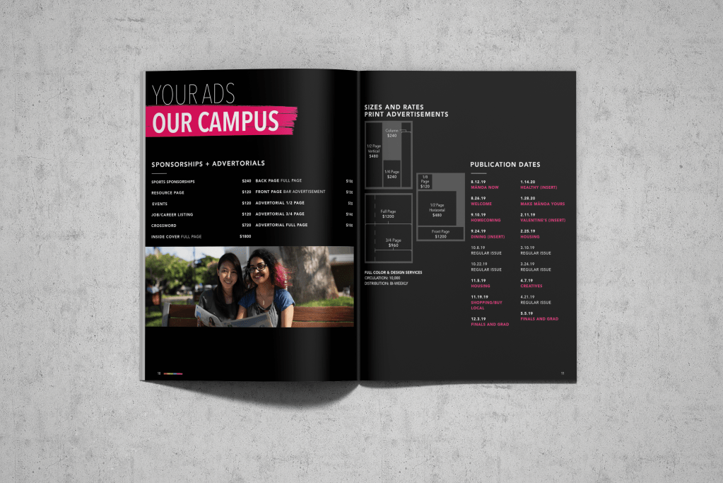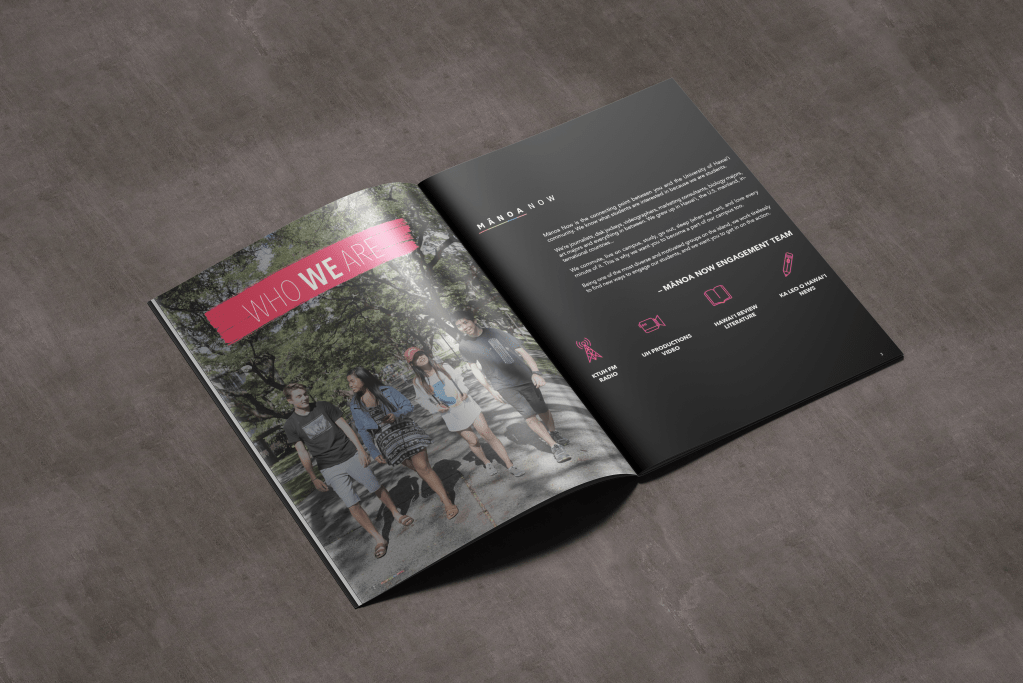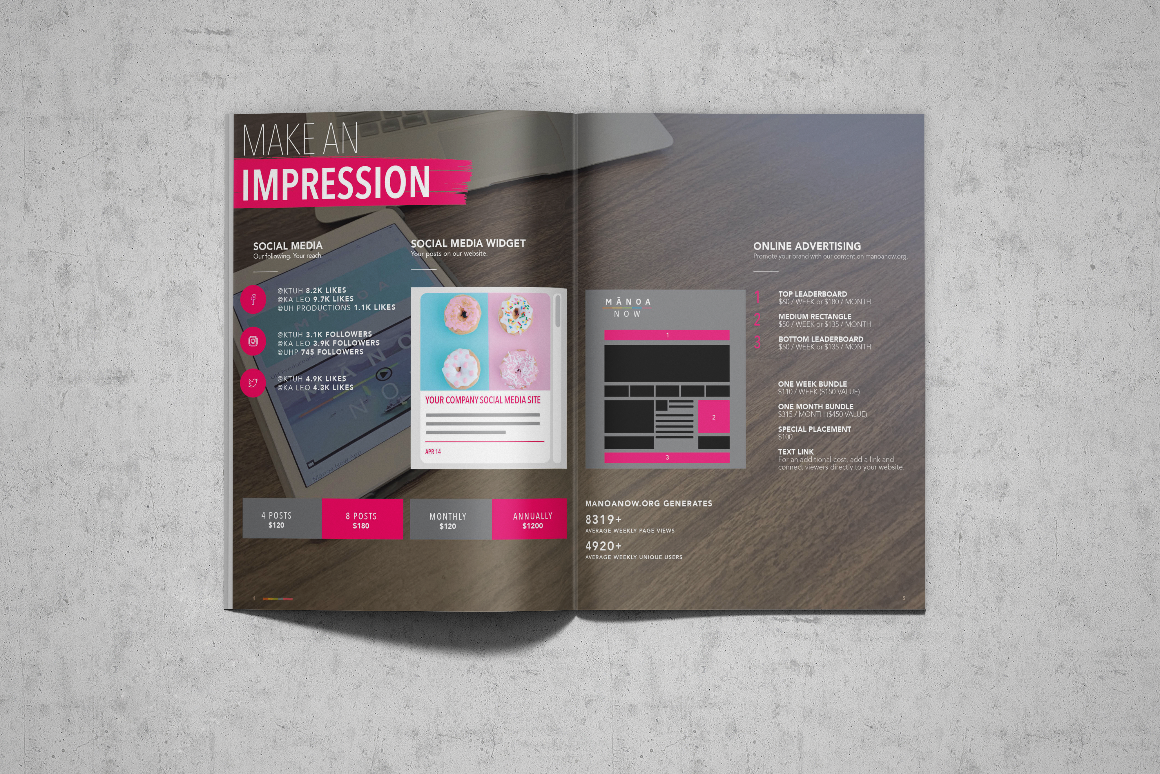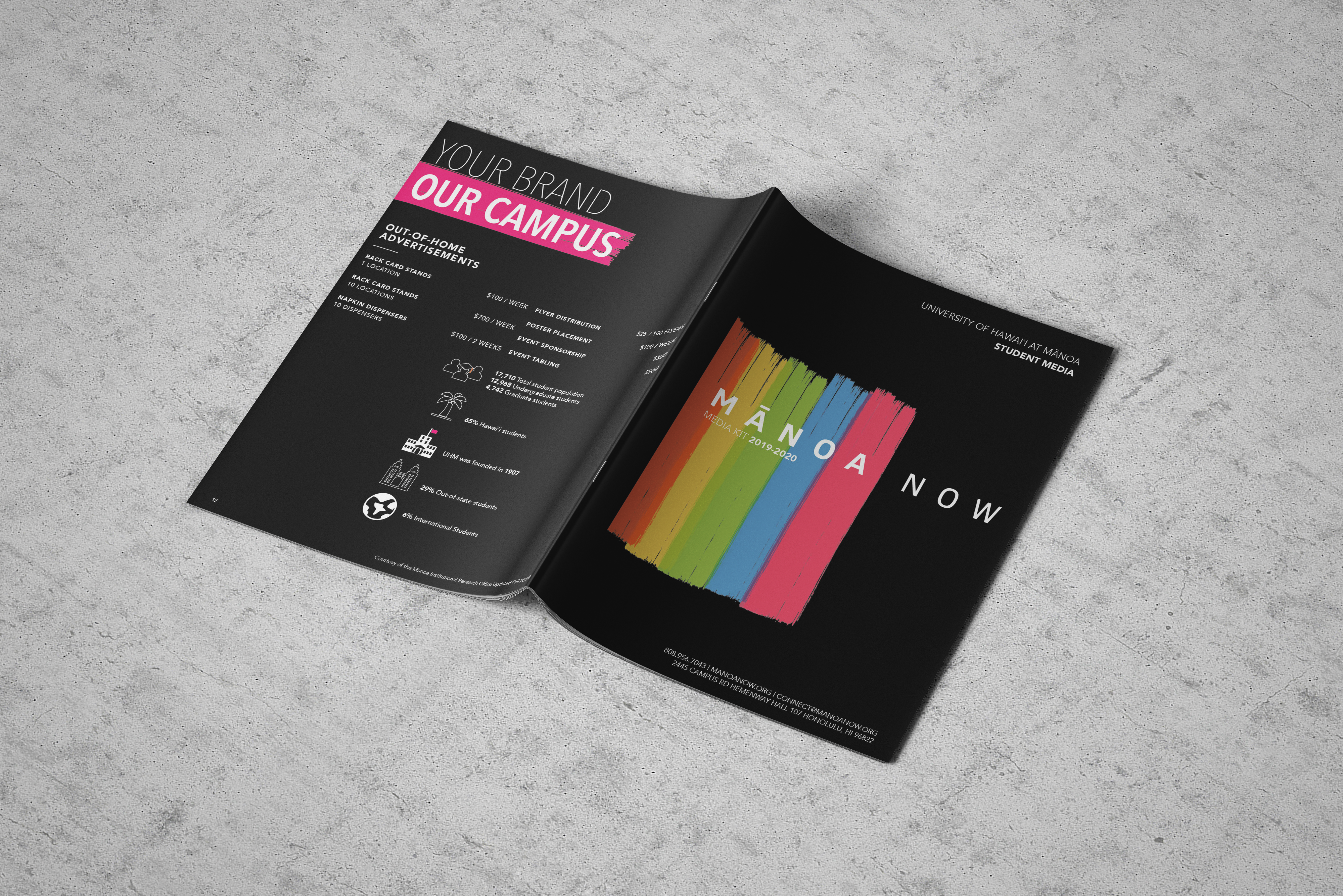 Summer of 2019 I was the lead for the Mānoa Now Media booklet. The booklet consisted of 12 pages that highlights our Student Media services to potential Oahu clients would would like to advertise at Manoa Now.